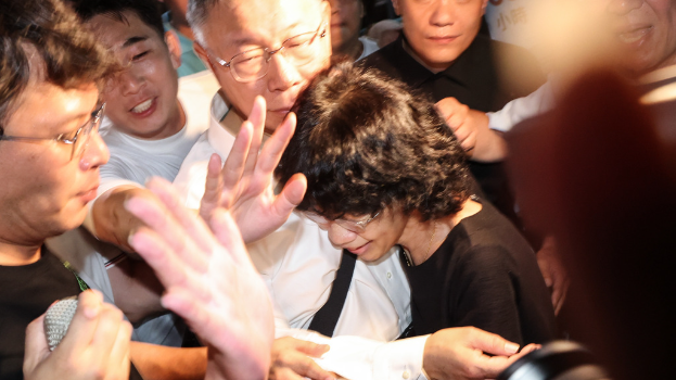 民眾黨主席、前臺(tái)北市長(zhǎng)柯文哲(中)無保請(qǐng)回,一步出法院大門,其妻陳佩琪(右)上前擁抱。