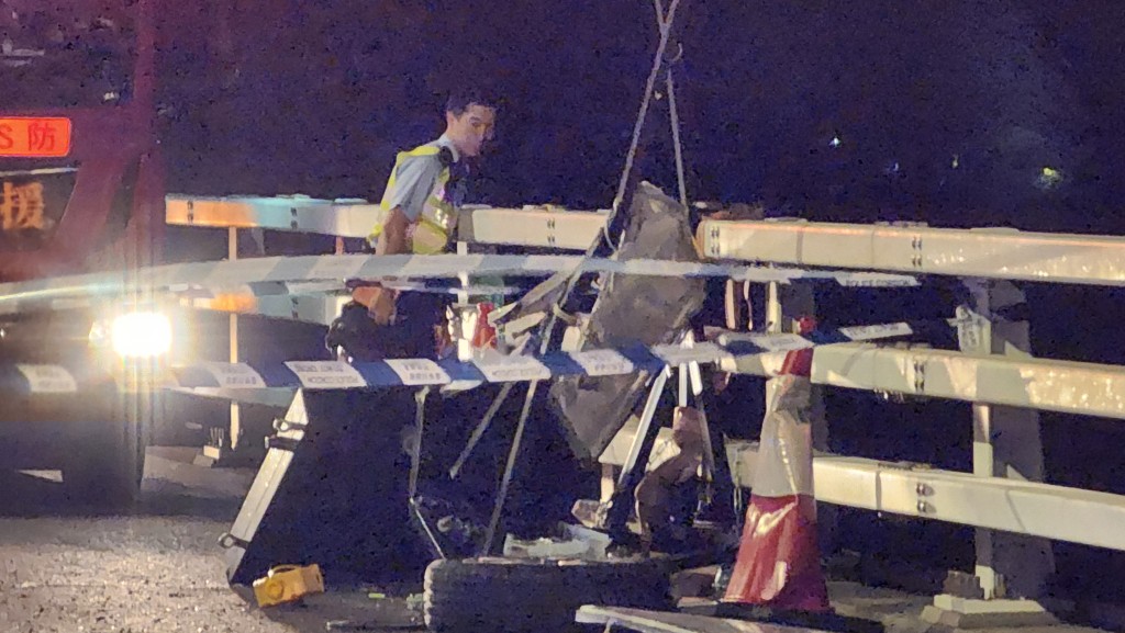 事發(fā)后,大批救援人員趕往現(xiàn)場進(jìn)行搜救,多輛消防車及救護(hù)車在現(xiàn)場戒備。就現(xiàn)場所見,一個電子顯示牌損毀嚴(yán)重,旁邊遺下一個車輪;路面滿布汽車零件及碎片。橋面的欄桿未有嚴(yán)重?fù)p毀,僅部分欄桿有輕微碰撞造成的痕跡,在快線亦留下煞車痕。另外,路面亦遺留一個恐怖的公仔頭,未知是否與事件有關(guān)。
