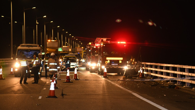 深圳灣大橋私家車沖越欄桿墮海,路邊指示牌被撞毀,快線留下煞車痕