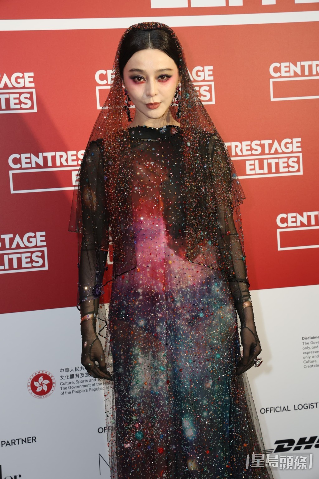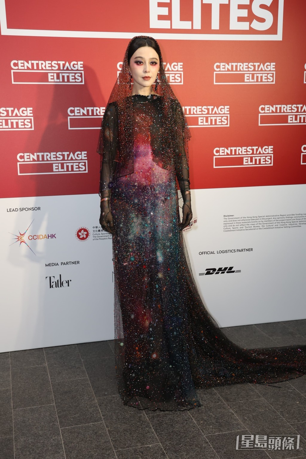 范冰冰身穿設(shè)計(jì)師云惟駿打造的一條以宇宙星體設(shè)計(jì)的透視拖尾紗裙現(xiàn)身。