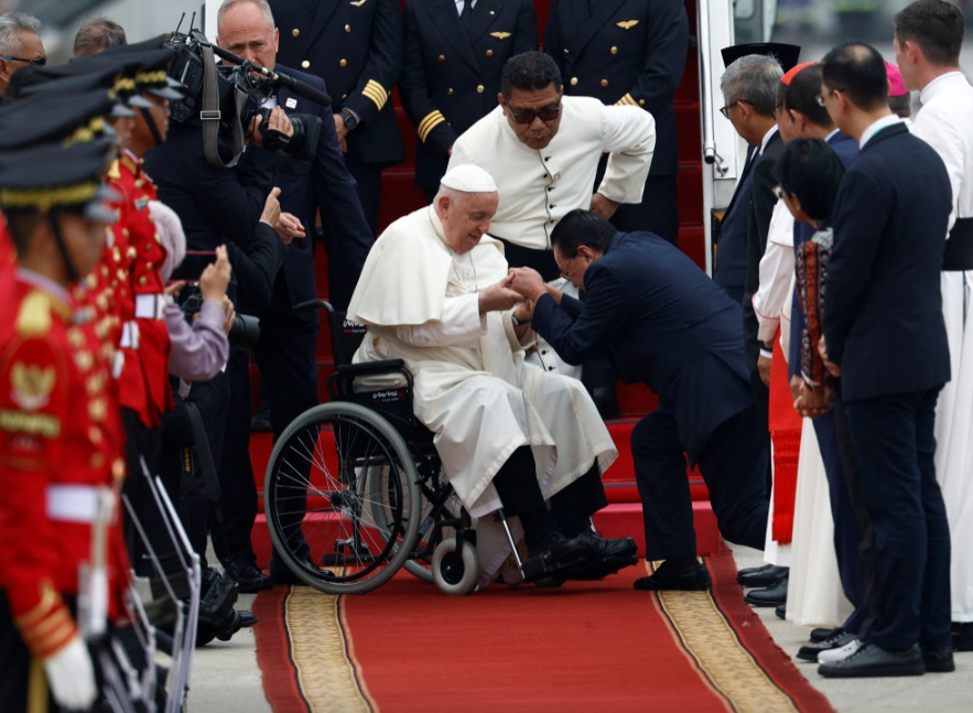 方濟(jì)各搭了13小時(shí)飛機(jī),在雅加達(dá)坐輪椅下機(jī),一直微笑揮手。在抵達(dá)駐當(dāng)?shù)氐慕掏⒋笫桂^時(shí),獲兒童歡迎。這是方濟(jì)各出任教宗以來時(shí)程最長、距離最遠(yuǎn)的外訪,對(duì)于健康日漸衰弱的他將是一大考驗(yàn)。