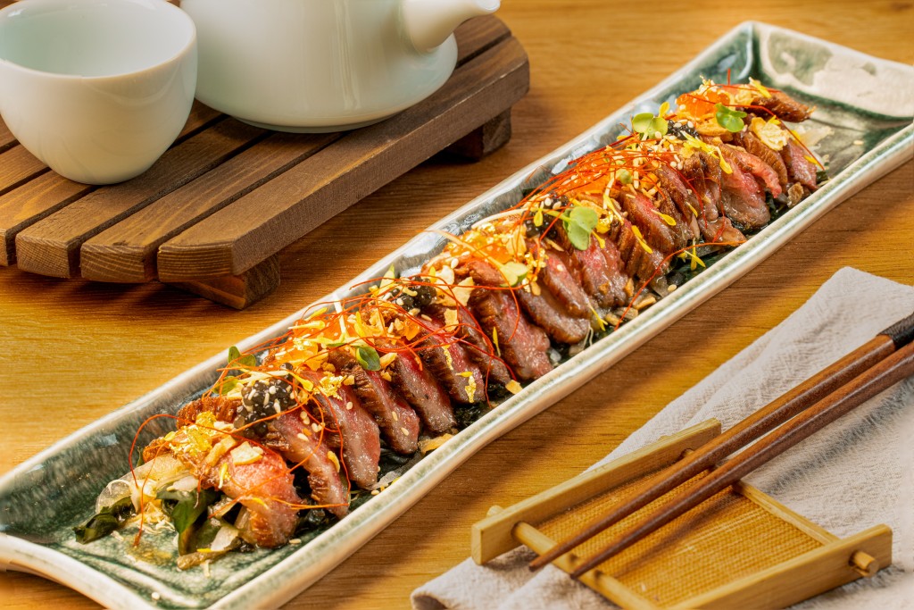 連續(xù)3年獲《米其林指南》推薦的九龍海逸君綽酒店“爐端燒”,新推出季節(jié)限定的“爐端燒廚師發(fā)辦晚餐”($980/位),爐端燒食材以海鮮為主,包括開胃小吃白飯魚干、壽司三點盛、特上時令刺身三點盛、磯煮小鮑魚、西京銀鱈魚、小椎茸,以及是日精選甜品,喜歡吃牛肉的話,還可另加雪花均勻的A4宮崎牛(加$200),令這頓日本菜更豐盛。