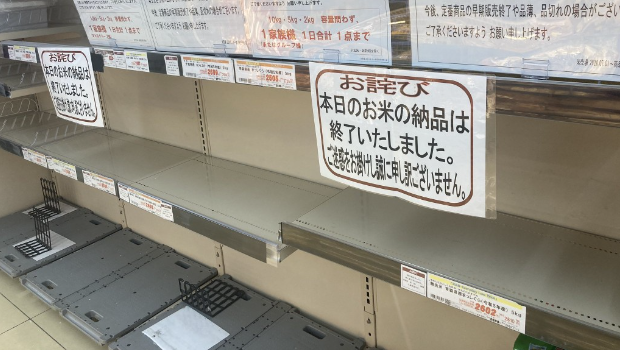 據(jù)日媒報(bào)導(dǎo),日本2023年夏季酷熱天氣下令米粒出現(xiàn)高溫?zé)岷?,?dǎo)致稻米產(chǎn)量大減,再加上疫情后大批游客涌入日本旅行,使市面上的白米庫存減少。此外,日本政府8月初發(fā)布南海海槽地震臨時(shí)情報(bào)、8月底珊珊臺(tái)風(fēng)侵襲日本,讓許不少日本人開始囤米,導(dǎo)致日本國產(chǎn)米開始從各超市貨架上消失。