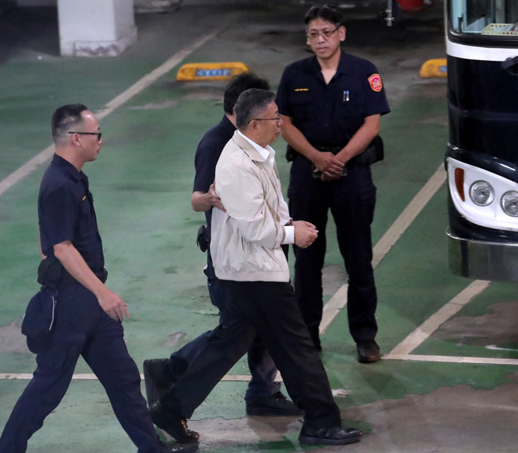 ▲前臺北市長柯文哲(穿白衣者)約于5日下午5時(shí)50分,被上銬押上囚車,移送臺北看守所。中時(shí)資料照