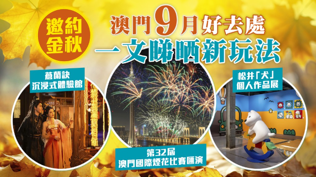 談到去澳門,除了飲飲食食同看演唱會(huì)外,其實(shí)還有很多新奇體驗(yàn)等大家去探索。今個(gè)九月,繼續(xù)推介多個(gè)澳門好去處。當(dāng)中包括令人大開眼界的第32屆澳門國際煙花比賽匯演、松井“犬”首次海外個(gè)人作品展、車迷必去的2024永利臻典夢(mèng)幻超跑展、人氣玄幻劇《蒼蘭訣》VR沉浸式體驗(yàn)館、2024世界旅游日托盤比賽和“嘗非遺?游世遺”傳統(tǒng)美食制作體驗(yàn)營(yíng)。