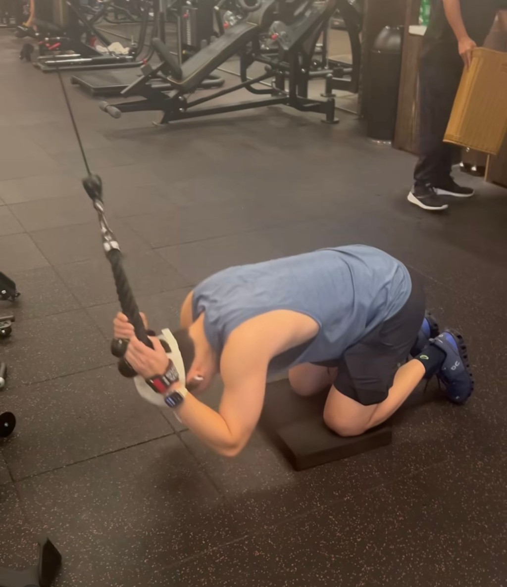 關(guān)智斌在做腹部鋼索下壓。