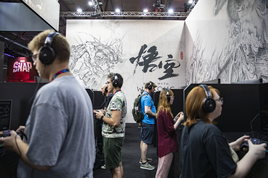 ▲歐美玩家在游戲展上的游戲科學(xué)攤位試玩《黑悟空》游戲。新華社