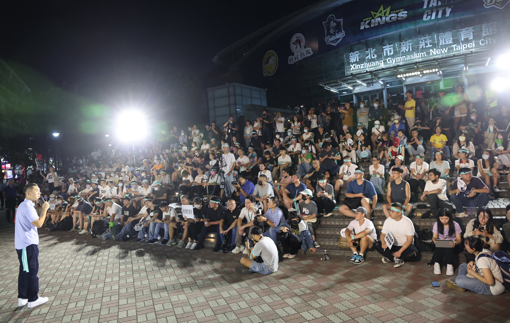 ▲民眾黨“Justice!為司法公義站出來”新北場宣講活動13日在新莊體育館外舉行,支持者坐在體育館前的臺階上聆聽臺上演講。 中時資料照片