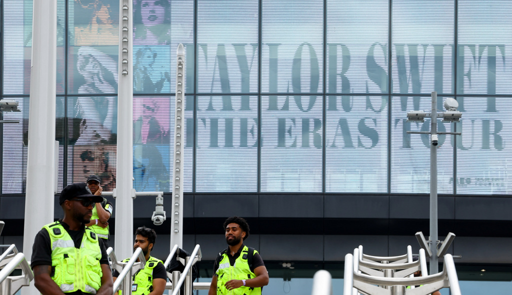 ▲泰勒·斯威夫特今年巡回全球舉辦“時(shí)代巡回演唱會(huì)”。圖為8月15日倫敦演唱會(huì)入口主視覺(jué)。 路透