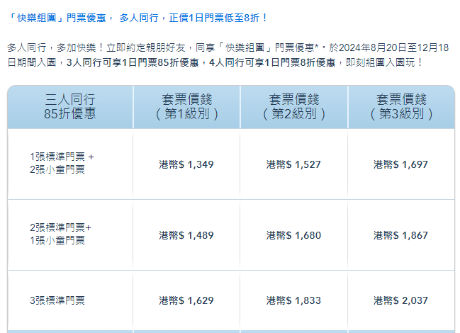 ▲香港居民專享快樂組團門票優(yōu)惠詳情。