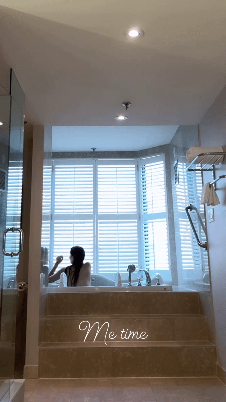 ▲周美欣到酒店出浴,大曬白滑玉背。