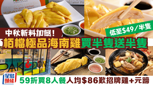臨近中秋,栢檔極品海南雞飯?zhí)旌蟮陼?huì)推出招牌去骨海南雞買半只送半只優(yōu)惠,折扣后半只低至$49(原價(jià)$196/組),并同步推出多款優(yōu)惠美食,包括以59折買肉骨茶,優(yōu)惠后$39/份(原價(jià)$66/份);59折買6至8人派對(duì)美食餐(優(yōu)惠價(jià)$688/份,8人平均$86/位,原價(jià)$1288/份),有極品去骨海南雞2只、鹵水元蹄 、秘制鹵燒豬頸肉、香煎手剁魚香肉餅 、小食拼盤2份、時(shí)菜2份、無味精靚湯/罐裝飲品/細(xì)肉骨茶8份等;食客亦可以75折購(gòu)買$100現(xiàn)金券。