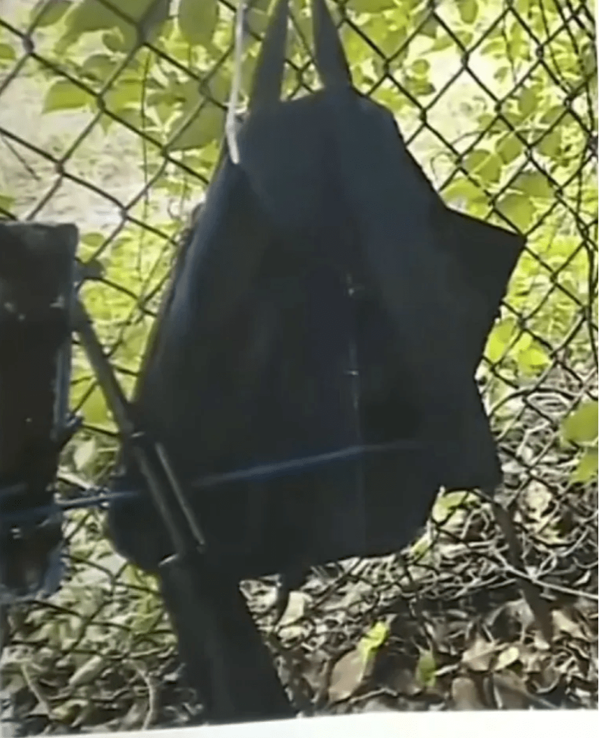 執(zhí)法部門分享的照片顯示,兩個黑色袋子掛在球場外灌木叢中的鐵絲網(wǎng)圍欄上,槍支支撐在它們之間,并指向圍欄的縫隙。 GoPro 相機(jī)掛在旁邊的柵欄上。