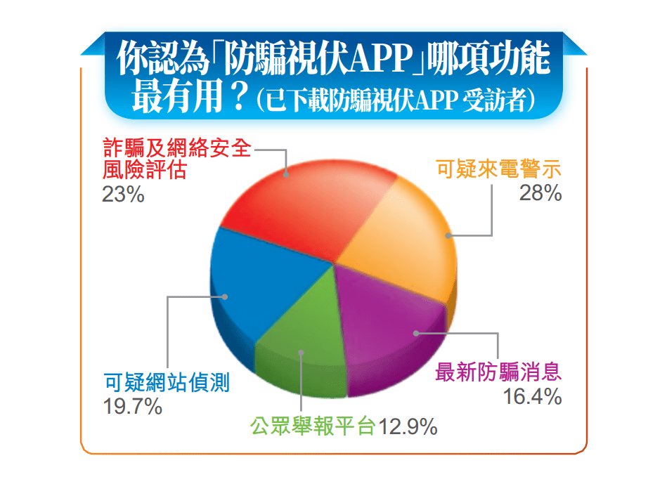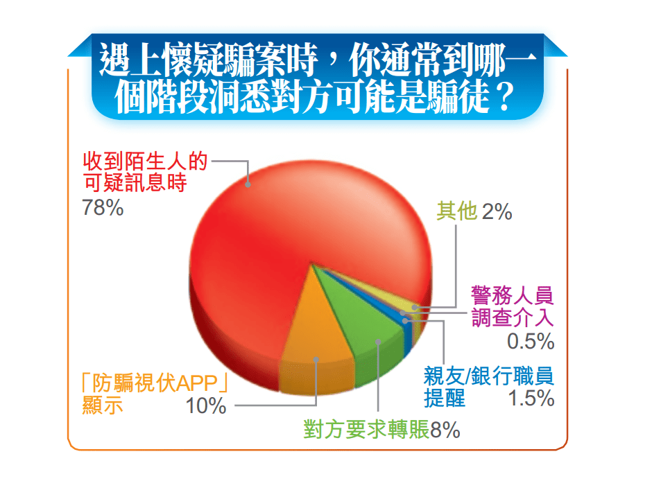 在騙徒水銀瀉地式攻擊下,43%受訪市民在過去一個(gè)月遇到懷疑騙案6次或以上,當(dāng)中一成人更多達(dá)20次或以上。78%受訪市民表示,當(dāng)收到陌生人的可疑訊息時(shí),已洞悉對(duì)方可能是騙徒;一成人指在使用警方“防騙視伏APP”后得悉;8%要到騙徒要求轉(zhuǎn)賬時(shí)才醒覺。