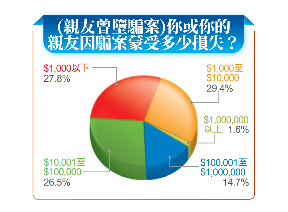 另外有32%受訪市民表示,自己或親友曾墮騙案,當(dāng)中逾八成損失10萬元(港幣,下同)或以下,1.6%損失100萬元以上。