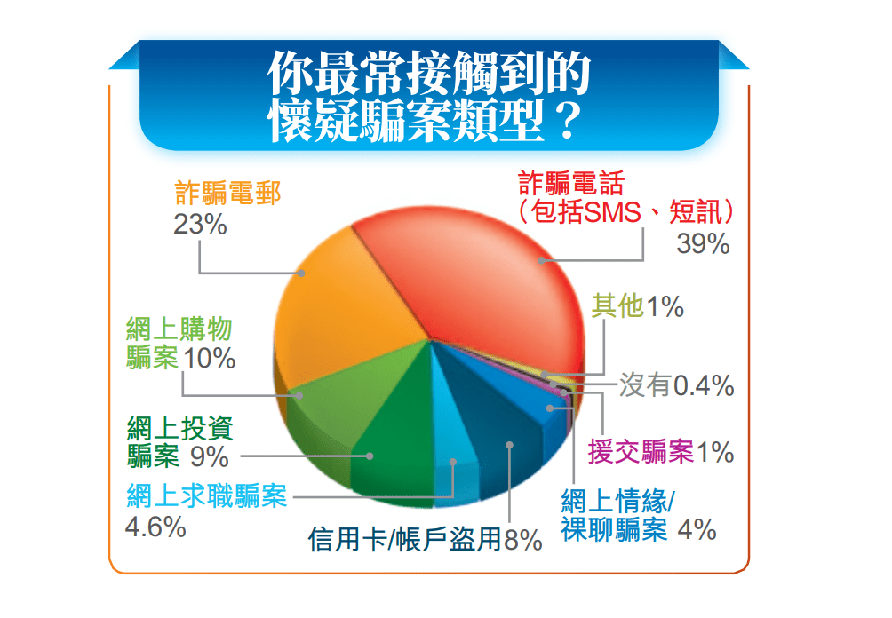 今次調(diào)查是以網(wǎng)上問卷形式于《星島頭條App》及《星島頭條》網(wǎng)站進(jìn)行,總參與人數(shù)超過1萬,反應(yīng)相當(dāng)踴躍。結(jié)果顯示,有逾9成受訪市民表示在過去一個(gè)月曾遇懷疑騙案;被問到“你最常接觸到的懷疑騙案類型?”以詐騙電話最多,達(dá)39%;其次是詐騙電郵,占23%;之后是網(wǎng)上購物騙案,占10%。