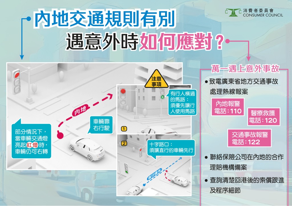 與香港的交通規(guī)例不同,在內(nèi)地駕駛時,當(dāng)車輛交通燈為紅燈或仍可右轉(zhuǎn)。惟駕駛者須留意,如為十字路口,須讓直行的車輛先行; 如為有行人橫過的馬路,則須優(yōu)先讓行人使用馬路。