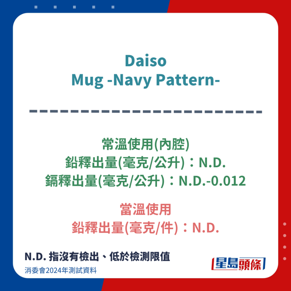 在鎘的檢測(cè)中,Daiso Mug - Navy Pattern-、Dunoon Fine Bone China Cosmos A Design by Caroline Dadd(P08H01)及小號(hào)四方杯Venus Porcelain(224-301)三款陶瓷杯的內(nèi)腔部分有鎘釋出,檢出量為每公升0.012毫克至0.060毫克,均低于標(biāo)準(zhǔn)容許限值(每公升0.25毫克)。