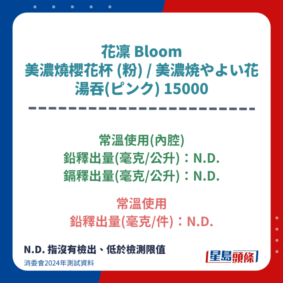 測(cè)試結(jié)果顯示,包括repeat repeat Contemporary Bone China Menagerie、Dunoon Fine Bone China Cosmos A Design by Caroline Dadd (P08H01)及DYNASTY Fine Bone China 優(yōu)質(zhì)骨瓷經(jīng)典玫瑰-鼎鴻奶杯 DYNASTY 2222032 Mug (3104-94)之三款陶瓷杯.及陳設(shè)瓷器 - 合興隆瓷莊 Porcelain Ware - Hop Hing Lung、iCi LA VIE 骨瓷 NT19123-4.5" 飯碗和Cheng's 5.5"保鮮密封湯杯之三款陶瓷碗,在口緣位置檢測(cè)到的鉛釋出量介于每件0.10毫克至0.31毫克之間,均符合相關(guān)法規(guī)要求。