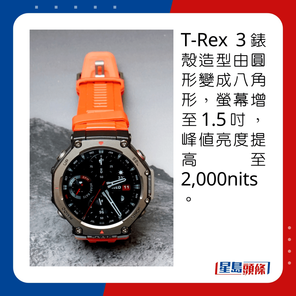 近年高階智能運動手表開始改用鈦金屬,惟售價并不便宜,T-Rex 3當然也沒用上,不過全新八角造型的表殼一如同系旗艦T-Rex Ultra,采用316L不銹鋼物料,加上表面換上Gorilla Glass保護,硬凈及耐撞程度比上代大為提升,而且AMOLED熒幕亦由1.39吋加大至1.5吋,峰值亮度倍增至2,000nits,大白天查看通知或運動數(shù)據(jù),顯示一樣清晰明亮。