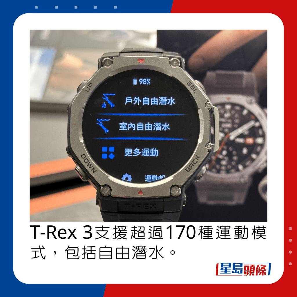 即使身價不同,T-Rex 3一如高階智能運動手表所標榜可作潛水用途,除了具備10 ATM防水,還有可自由潛水至45米水深的認證,比T-Rex Ultra的30米更強,加上軍用級別的表身可以在70℃至-30℃極端環(huán)境如常運作,絕對可以伴隨運動好者上山下海。說起運動,T-Rex 3支援超過170種運動模式,熱門如跑步、游泳、單車、肌肉訓練以外,還有自由潛水、三項鐵人、滑雪,甚至跳傘、滑翔傘等,隨你挑戰(zhàn)極限。