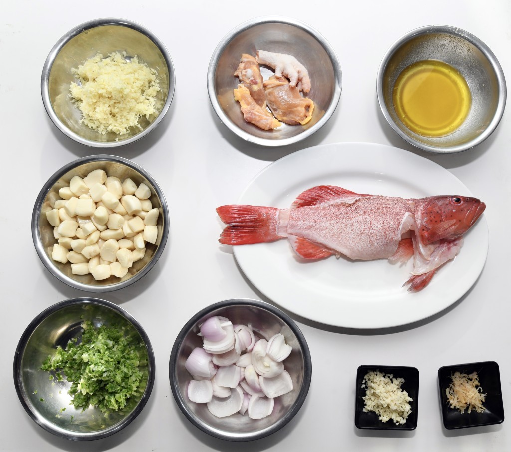1. 東星斑起出兩邊魚肉,將魚肉切塊,魚頭及魚尾斬件,留起魚骨及洗凈。起油鑊,下魚骨煎香加雞件再煎香,逐少注入滾水熬煮4至5分鐘,加調(diào)味料略煮,隔渣成魚湯。