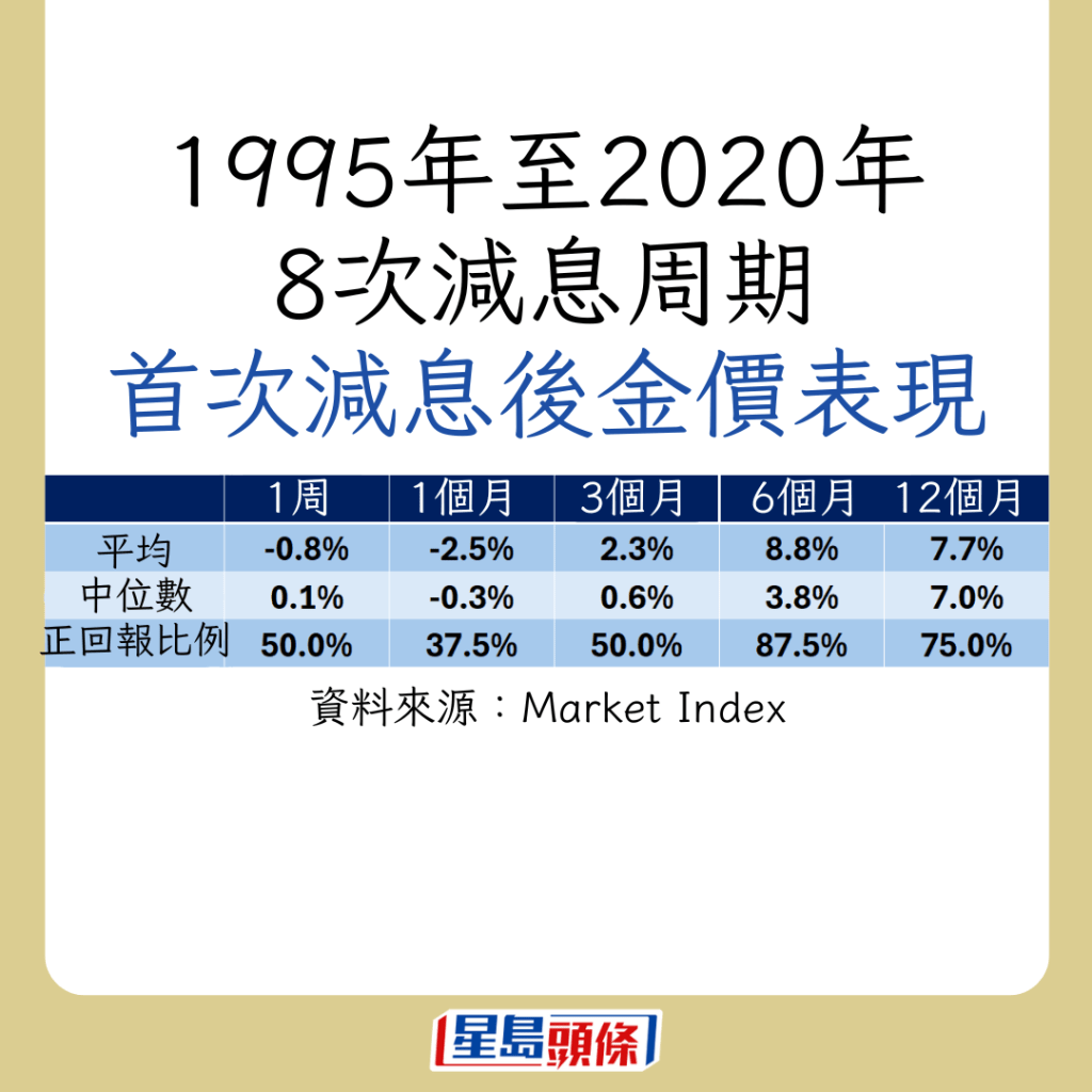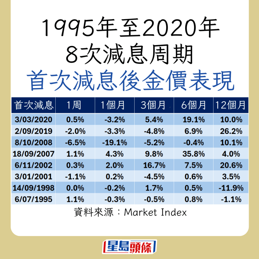 不過(guò),在第一次減息的一周及一個(gè)月后,金價(jià)往往出現(xiàn)回調(diào),分別平均下跌0.8%及2.5%。若看減息一個(gè)月,8次之中只有3次正回報(bào)。