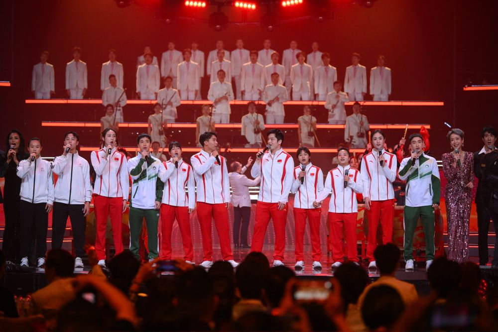 晚會上,多位載譽歸來的中國奧運健兒亮相。樊振東、全紅嬋、馮紫琪以及王柳懿、王芊懿攜手港澳運動員代表,向明年即將在粵港澳三地聯(lián)合主辦的第十五屆全運會送上祝福。多才多藝的健兒們也一展歌喉。