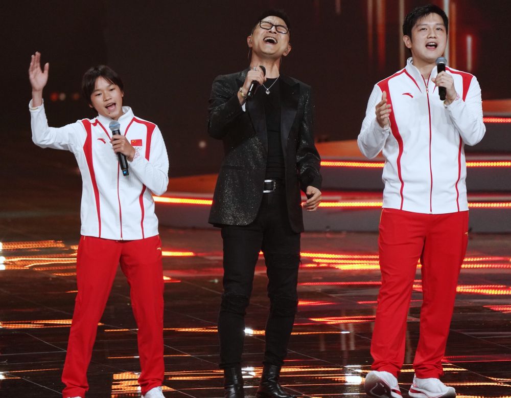 9月22日,全紅嬋、汪峰、樊振東(從左到右)在演唱《我愛你中國》。