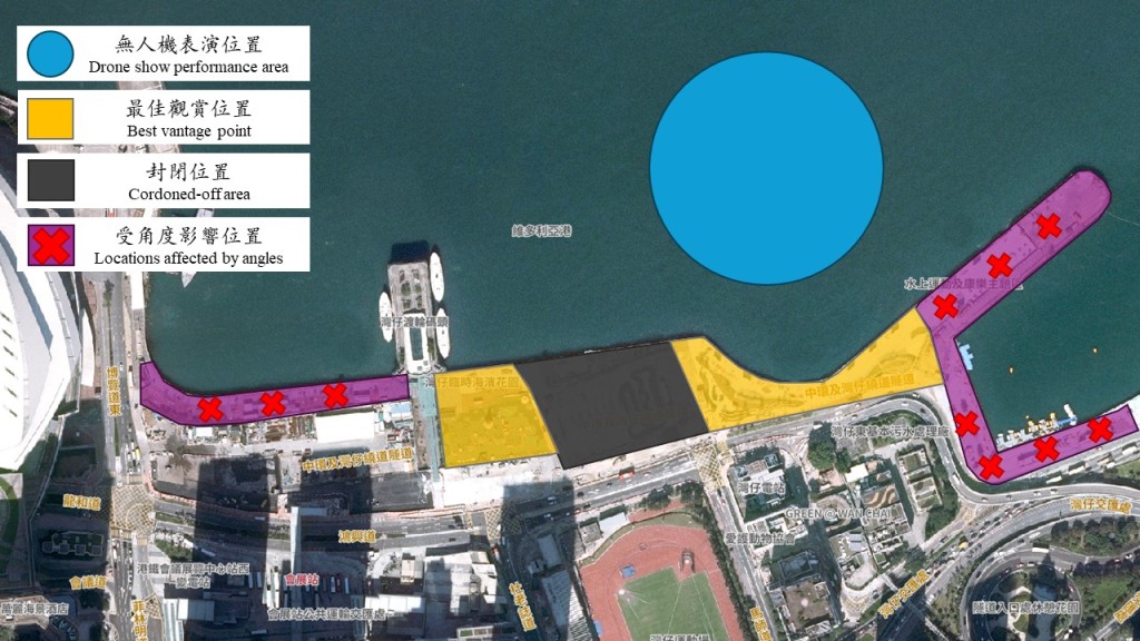 注意:部分灣仔海濱場地因受角度影響,未能清晰觀賞表演;對岸九龍半島未能欣賞是次表演。
