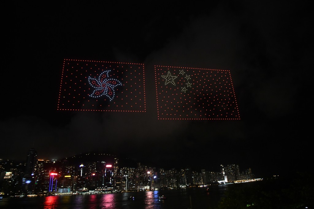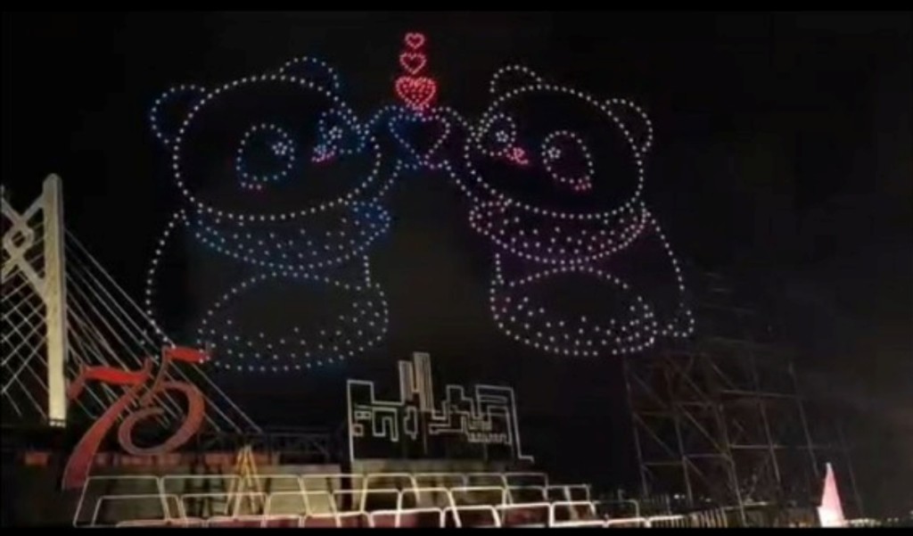 為慶祝國(guó)慶75周年,政府將在國(guó)慶日前夕即下周一(30日)晚上,在西九文化區(qū)藝術(shù)公園舉辦“新生代千人合唱賀國(guó)慶”活動(dòng),有破紀(jì)錄的2099架無(wú)人機(jī)將劃破維港上空,組成不同的團(tuán)案,與全港市民迎接國(guó)慶。 《星島》記者昨(24日)晚在西九文化區(qū)獨(dú)家直擊活動(dòng)的彩排過(guò)程,雖然不時(shí)下著微雨,但有2000多架無(wú)人機(jī)在空中組成“國(guó)”、“75”、“鳳凰”等,其中亦少不了近日熱爆的“熊貓”圖案,彩排至深夜仍然繼續(xù)。