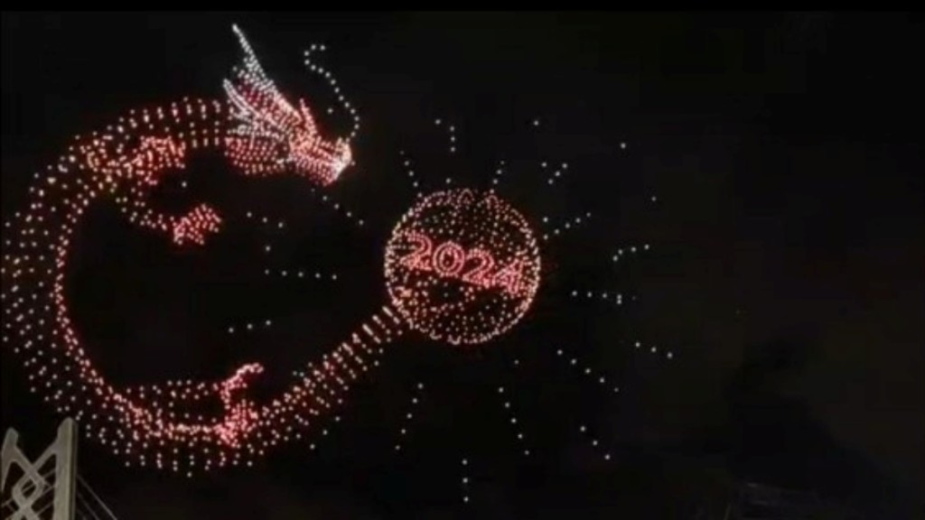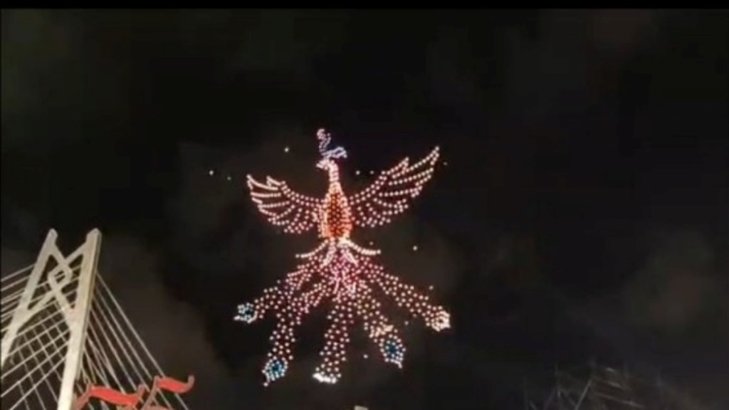 ▲有2000多架無(wú)人機(jī)在空中組成國(guó)、75、鳳凰等圖案。 何健勇攝