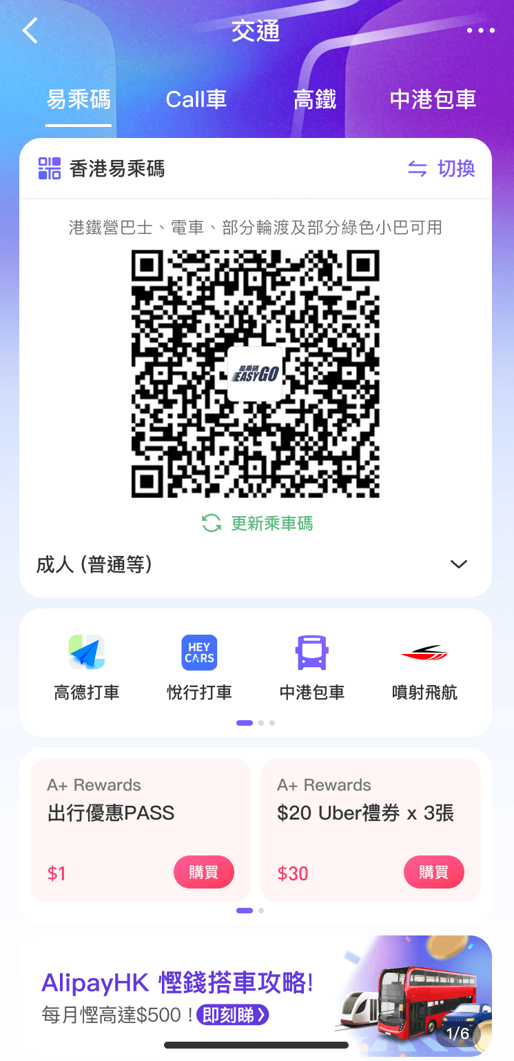AlipayHK指,正不斷拓展本地及內(nèi)地交通服務,包括早前已在香港接入港鐵、九巴、城巴、渡海小輪、綠色專線小巴及電車,在內(nèi)地打通了深圳、廣州、佛山、中山、上海等城市的公共交通工具,同時覆蓋本地及內(nèi)地高德打車、Uber、高鐵等交通場景,而在其App內(nèi)使用跨境乘車毋須手續(xù)費,并有優(yōu)惠匯率。
