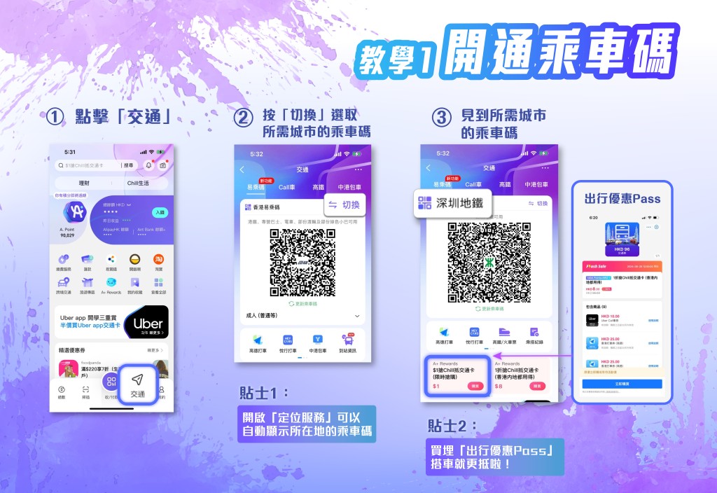 適逢國慶,AlipayHK聯(lián)乘內(nèi)地支付寶,自10月1日起在兩地錢包同步推出“出行優(yōu)惠Pass”,覆蓋本地及內(nèi)地AlipayHK的交通工具場景,當中包括25元香港高德打車劵1張、5元內(nèi)地高德打車券1張、2元香港易乘碼券3張、2元內(nèi)地乘車券3張、10元香港高鐵券1張,以及10元Uber Call車券,價值逾60元。而在10月1日當天,將推出限時優(yōu)惠以1港元搶購該“出行優(yōu)惠Pass”,搭一程可回本。