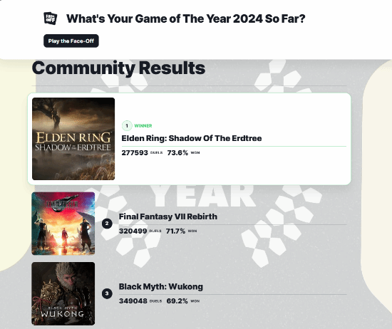 9月26日消息,IGN年度游戲投票頁面顯示,《黑神話》支持率已跌下70%來到69.2%,第一名《艾爾登法環(huán):黃金樹幽影》和第二名《最終幻想7:重生》的支持率均小幅上漲,來到71.7%和73.4%?!逗谏裨挕放c他們差距似乎在悄然擴(kuò)大。