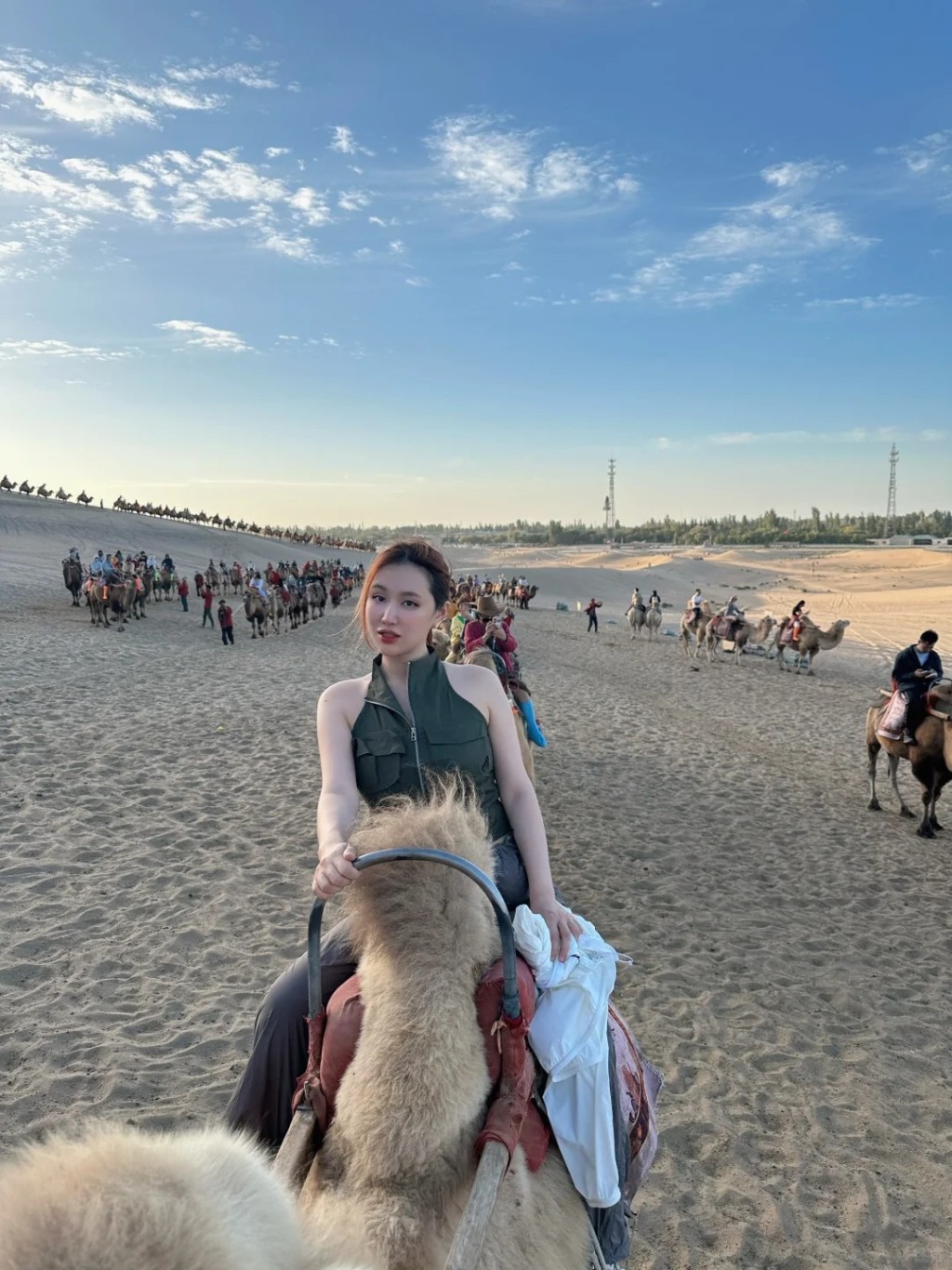 ▲王冰冰還去騎了駱駝,坐在駱駝雙峰之間于沙漠中游走。