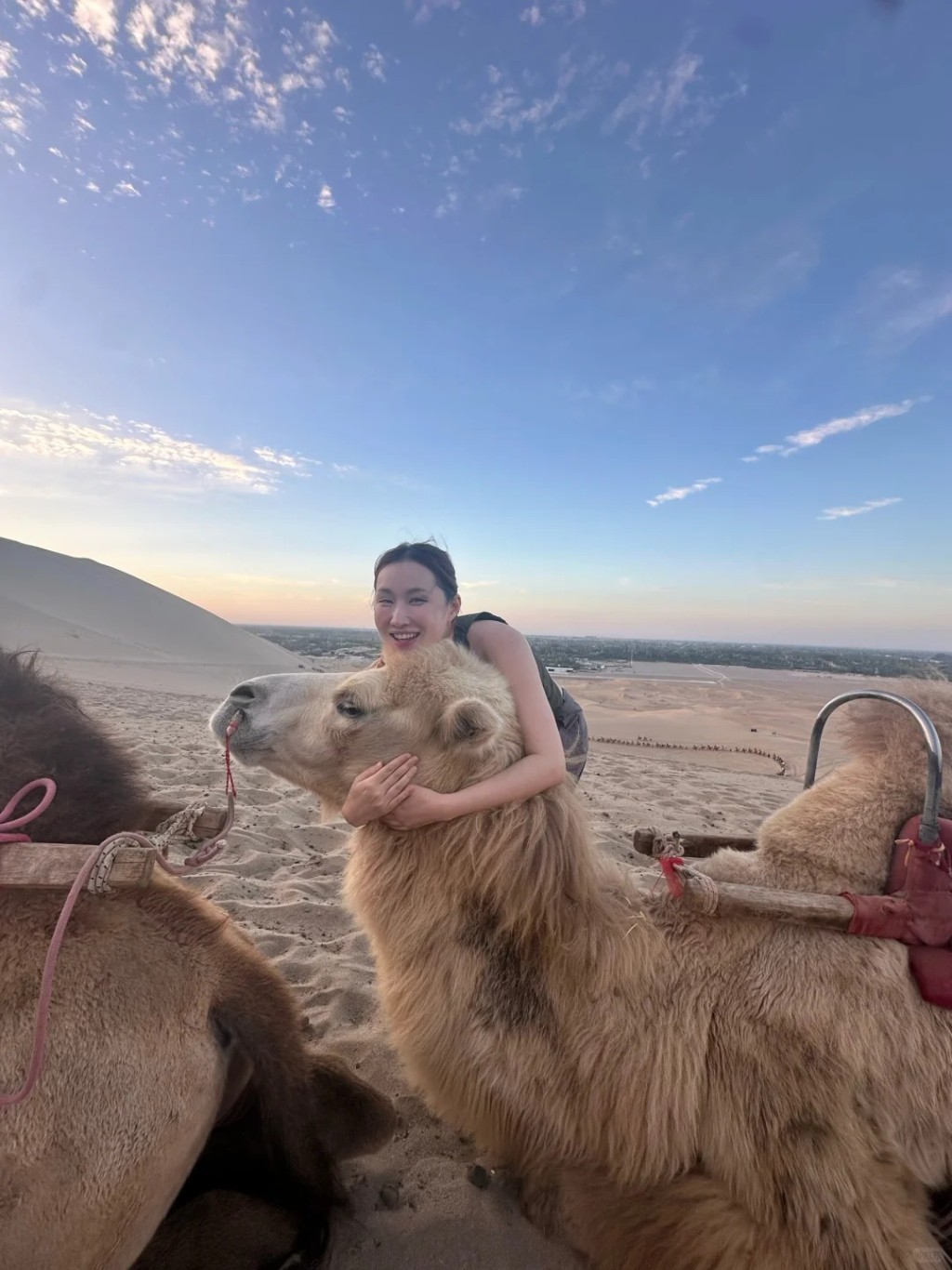 王冰冰還去騎了駱駝,坐在駱駝雙峰之間于沙漠中游走。