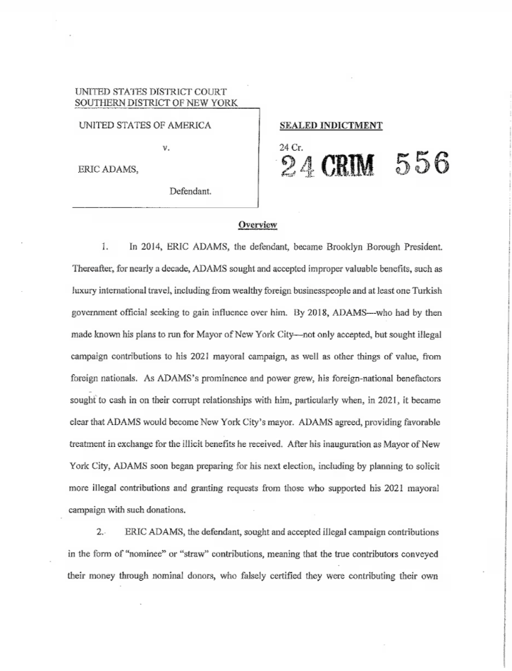 在檢方公布長達(dá)57頁的起訴書中,亞當(dāng)斯涉及的控罪可追溯至2014 年,當(dāng)時仍擔(dān)任布魯克林區(qū)長的他,接受了土耳其航空公司價值數(shù)萬美元的免費旅行,并只用了600美元便可享用伊斯坦布爾瑞吉酒店的豪華套房兩晚,遠(yuǎn)低于實際費用7,000 美元。