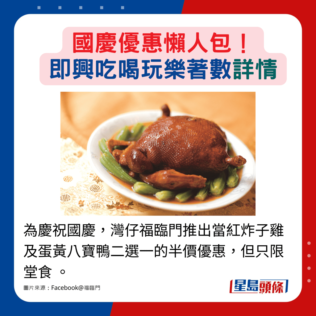為慶祝國慶,灣仔福臨門推出當(dāng)紅炸子雞及蛋黃八寶鴨二選一的半價優(yōu)惠,但只限堂食 。