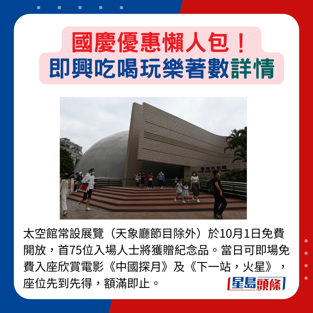 ▲太空館常設(shè)展覽(天象廳節(jié)目除外)于10月1日免費(fèi)開放,首75位入場人士將獲贈紀(jì)念品。當(dāng)日可即場免費(fèi)入座欣賞電影《中國探月》及《下一站,火星》,座位先到先得,額滿即止。
