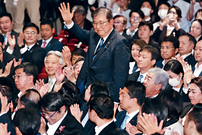 石破茂周五當(dāng)選自民黨總裁后向支持者揮手致意。
