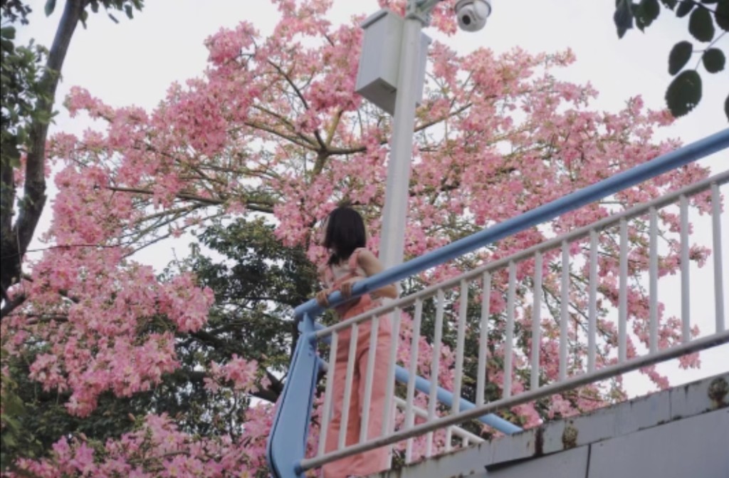 蕭崗天橋可觀賞異木棉。(圖片來源:小紅書@福西西)