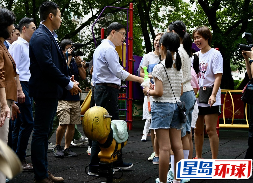 ▲李家超途經(jīng)游樂場時與多位小朋友對談交流。 蘇正謙攝