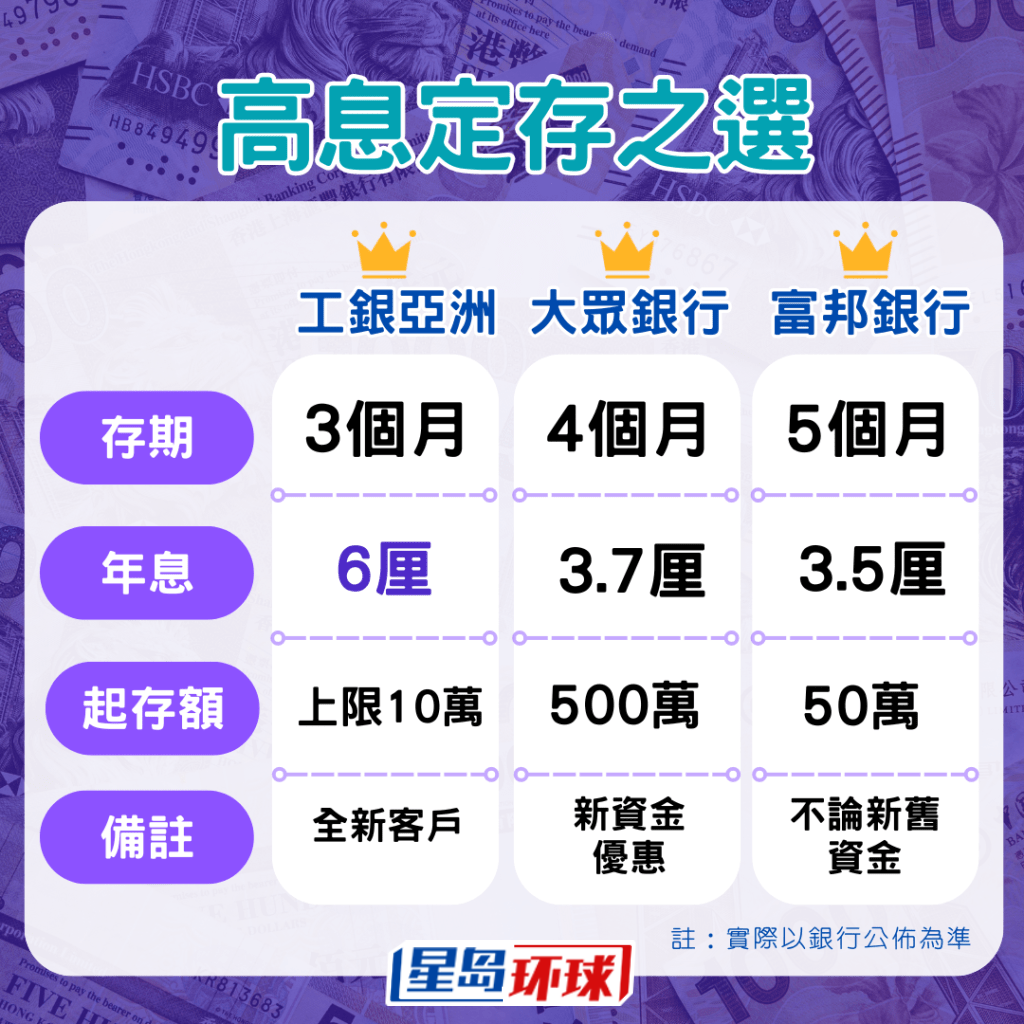 另一方面,工銀亞洲全新客戶3個月定存優(yōu)惠仍有3.88厘,但需為全新理財金、理財e時代或綜合客戶,起存額為10萬至80萬新資金,惟推廣期至9月30日,未知會否延長。該行另一款6厘息新客優(yōu)惠則至10月31日,但本金上限為10萬元,即3個月收息最多1,500元。