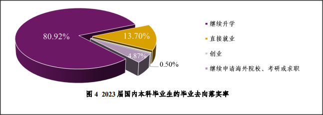 以2023屆本科畢業(yè)生為例:畢業(yè)生的整體去向落實(shí)率為95.13%,持續(xù)在高位保持穩(wěn)定,屬國(guó)內(nèi)高校前列;升學(xué)比例突破八成,達(dá)80.92%;升學(xué)畢業(yè)生主要以出國(guó)出境為主,美國(guó)為首要目標(biāo);升學(xué)院校水平不斷提升,21.70%的升學(xué)畢業(yè)生攻讀世界大學(xué)排名前10名高校的學(xué)位,71.55%攻讀世界大學(xué)排名前50名高校的學(xué)位就業(yè)薪酬平均年薪為17.08萬元人民幣;畢業(yè)生的就業(yè)地點(diǎn)和單位性質(zhì)更加多元,足跡遍布各地各類優(yōu)質(zhì)企業(yè)。香港特區(qū)IANG工作簽證的適用范圍拓展至港中大(深圳),就業(yè)面更廣泛;選擇前往國(guó)有企業(yè)的比例同比上漲12.38個(gè)百分點(diǎn)。