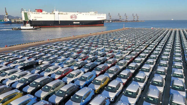 ▲山東煙臺(tái)港的比亞迪貨船和準(zhǔn)備出口的電動(dòng)車。(中新社)