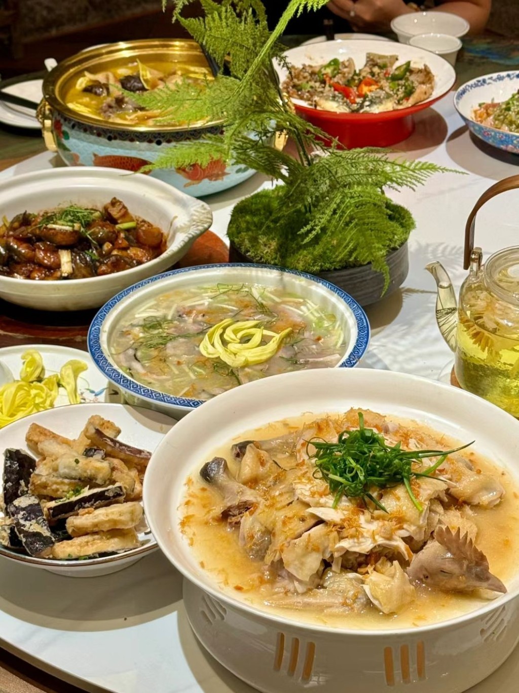 香山家宴在AAA荔景苑景區(qū)內(nèi),開(kāi)業(yè)7年,2021年獲得“中國(guó)餐廳金獎(jiǎng)”,佔(zhàn)地30畝,典型嶺南園林設(shè)計(jì),有棵800年歷史老荔枝樹(shù)、荷花池、魚(yú)池喂錦鯉,是旅游打卡好去處。菊花菜式有涼拌菊花,加入香蕉、花生、白糖和沙律醬,爽口清甜,對(duì)香港人來(lái)說(shuō)頗為新奇;菊花水欖是小欖特色小吃,有點(diǎn)像湯圓;點(diǎn)心拼盤(pán)有菊花點(diǎn)心,軟糯可口。其他傳統(tǒng)地道美食有小欖炸魚(yú)球、大煎堆、烤乳鴿、姜蔥紫蘇豆豉炒脆肉鯇、南頭銅盤(pán)蒸雞等。