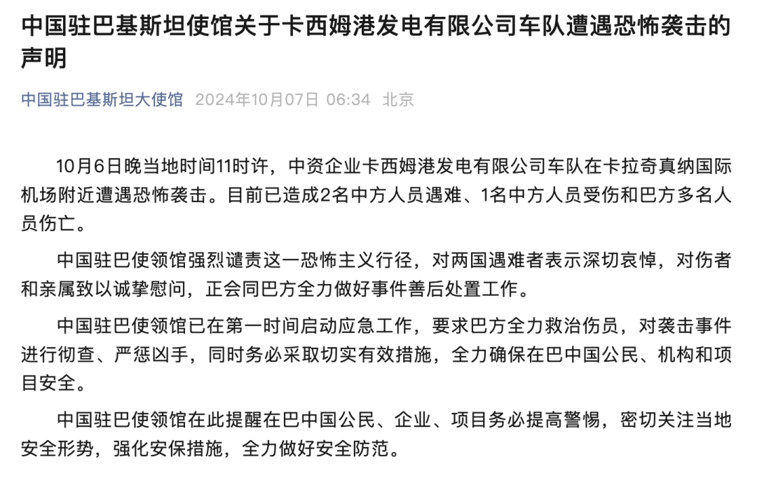 據(jù)中國(guó)駐巴基斯坦大使館今晨消息:10月6日晚當(dāng)?shù)貢r(shí)間11時(shí)許,中資企業(yè)卡西姆港發(fā)電有限公司車隊(duì)在卡拉奇真納國(guó)際機(jī)場(chǎng)附近遭遇恐怖襲擊。目前已造成2名中方人員遇難、1名中方人員受傷和巴方多名人員傷亡。