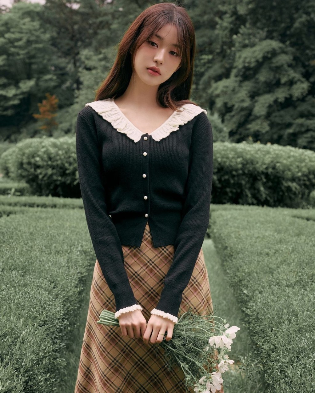 韓國女團IVE成員張員瑛Rufles細節(jié)針織外套,配搭格紋半截裙,塑造典雅淑女形象。(圖片來源:1G@for_everyyoung 10)
