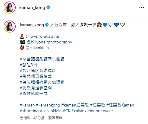 ▲江嘉敏更在hashtag打上“影相嗰日超怕羞”、“最性感嘅一次”。